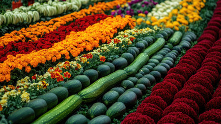Explore a picturesque garden featuring vibrant rows of vegetables and flowers, showcasing a stunning display of colors and textures in nature's bounty.