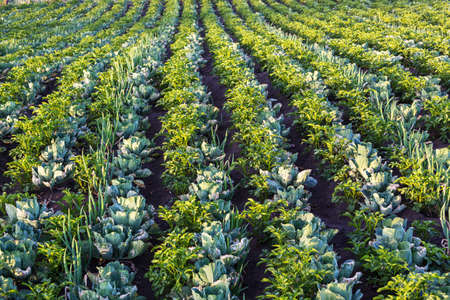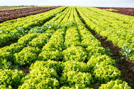 Agricultural landscape with rows of young lettuce plants on a sunny day