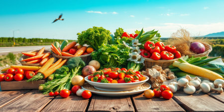 A rustic wooden table filled with an array of fresh organic vegetables displayed in woven baskets, set against a beautiful countryside landscape.
