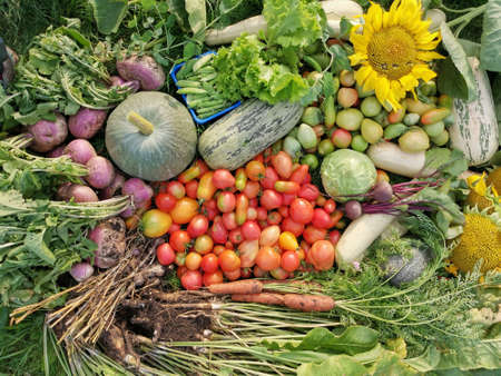 Top view of a lot of fruits and vegetables in the vegetable garden