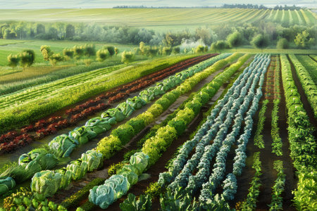 An expansive agricultural field stretches towards the horizon, showcasing meticulously organized rows of diverse vegetables bathed in the warm, golden light of sunrise. Crops such as corn, lettuce, cabbage, and tomatoes are clearly visible, displaying vibrant green hues and healthy growth. The orderly rows create a visually striking pattern across the fertile land. The early morning sun casts long shadows and illuminates the dew-kissed plants, highlighting the abundance and freshness of the...