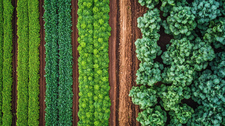 Aerial view of lush rows of fresh organic vegetables on a farm, showcasing vibrant greenery and the beauty of agricultural practices promoting health and sustainability.