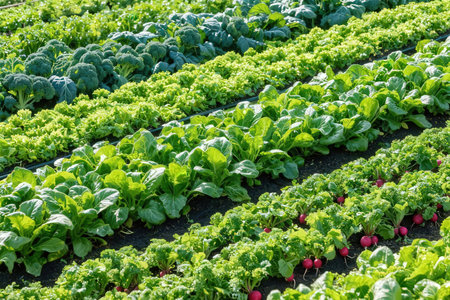 Aerial view of vibrant green rows of vegetables and leafy greens showcasing healthy growth in an organic farm setting under natural sunlight.