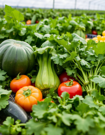 Vibrant garden setting with assorted lush vegetables and room for text placement