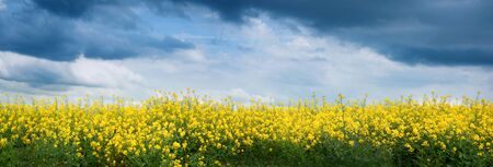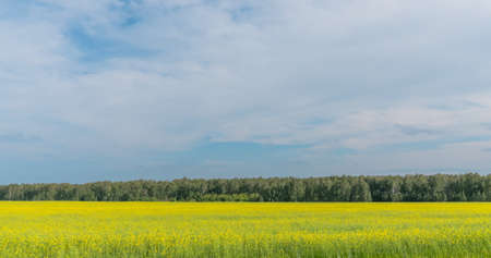 Banner Yellow rapeseed field under cloudy sky with forest on horizon