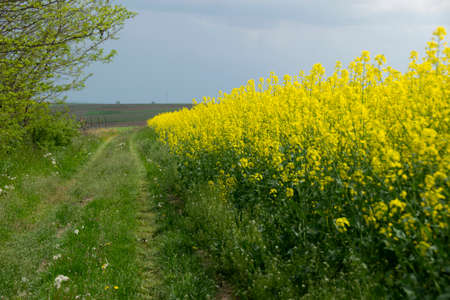 Flowering field of canola outdoors in spring in Hungary