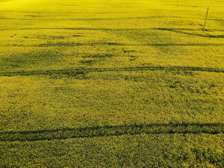 Rapeseed field in springtime. Aerial view of blooming rapeseed field.