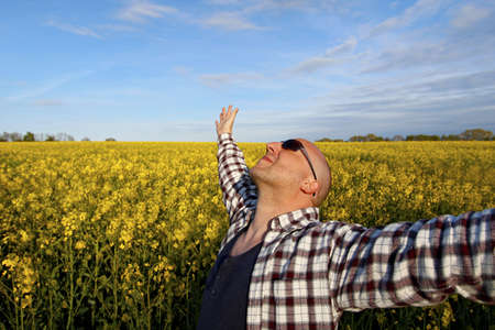 male enjoys being in a field with blossom