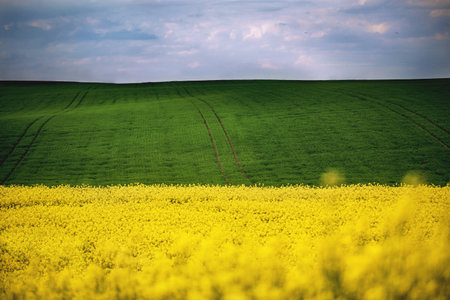 farm field lines of green and rapeflowerfield evening landscape