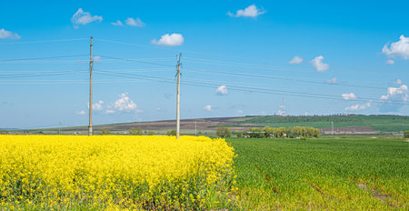 Bright yellow canola field and fluffy white clouds on a sunny day. Picturesque rural area in springtime. Photo of ecology concept. Agrarian industry. Location place Ukraine, Europe. Beauty of earth.