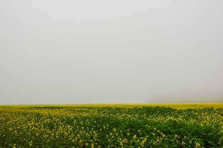 wonderful green and yellow field with dense white fog in autumn