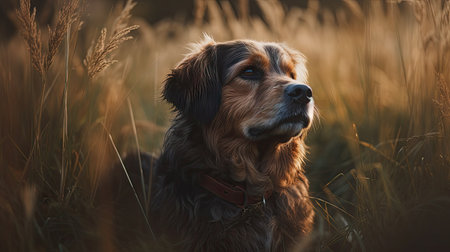 A dog is standing in tall grass, looking up at the camera. The scene is peaceful and serene, with the dog's fur blowing in the wind