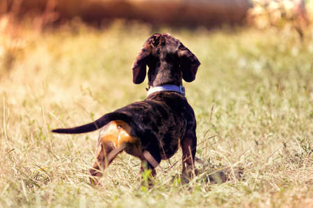 Happy dark color dog closing eyes sticking out his tongue in the field