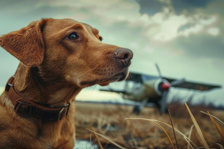 Closeup of a contemplative dog wearing a collar, with an old plane in the background
