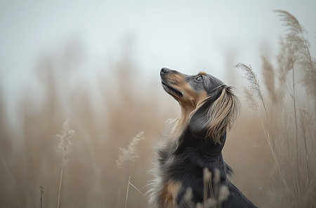 A dog portrait set in a field, showcasing various textures and tones brown fur, dry plants, and a muted sky create an evocative, rustic scene.