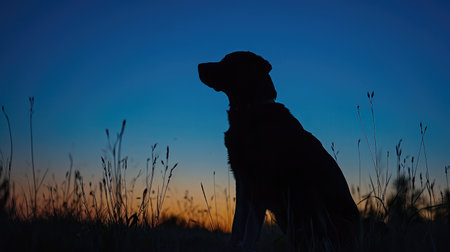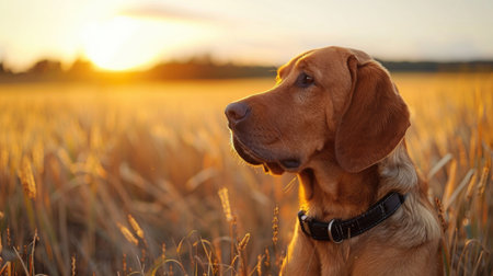 A loyal hunting dog sits alert beside its owner on a sunset-lit hillside in the countryside after a day outdoors