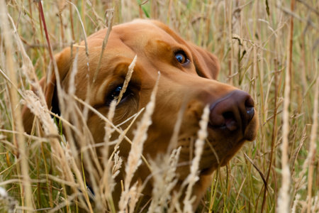 German shorthaired pointer dog looking out from tall golden reeds outdoors