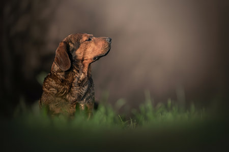 Russian brown spaniel lying in green grass in a field and lit by the setting sun