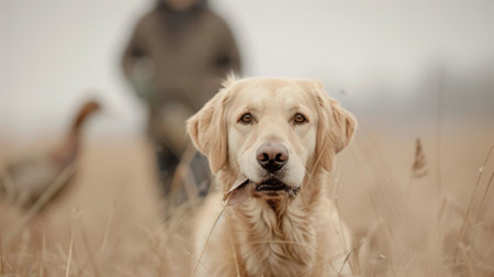 A golden retriever proudly carries a game bird in its mouth while its owner walks in the background. The early morning light casts a warm glow over the open field, enhancing the peaceful outdoor atmosphere.