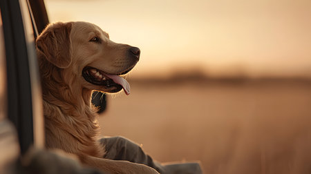 A joyful golden retriever leans out of a car window, tongue out, basking in the warm sunlight and wind. The serene background hints at a beautiful landscape just outside the car.
