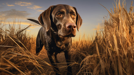 An AI generated illustration of an adorable brown and black German Shorthaired Pointer in the field