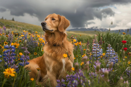 A golden retriever rests in a colorful field of wildflowers, embodying tranquility and the joy of nature's beauty. A majestic golden retriever posing in a field of flowers, AI generated