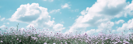 A beautiful and serene landscape of a field filled with pink and white flowers in full bloom with a blue sky and green grass. AI Generative.
