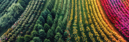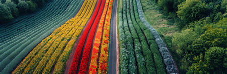 Aerial view of vibrant flower rows interspersed with green plants in a serene garden. The colorful blooms create a striking pattern against the earthy soil.