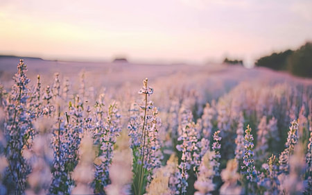 A breathtaking view of an expansive field filled with blue flowers under a serene sunset sky. Perfect for nature lovers and landscape enthusiasts.