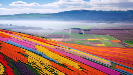 Generative AI : Aerial view of colourful agricultural field in Noordbeemster North Holland The Netherlands