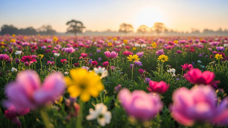 A vibrant field of colorful blooming flowers in pink, yellow, and white is bathed in the soft light of a sunrise.