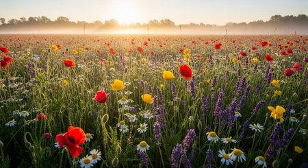 A vast field of wildflowers, featuring red poppies, blue cornflowers, and yellow buttercups, bathed in the soft light of sunrise with a gentle mist covering distant...