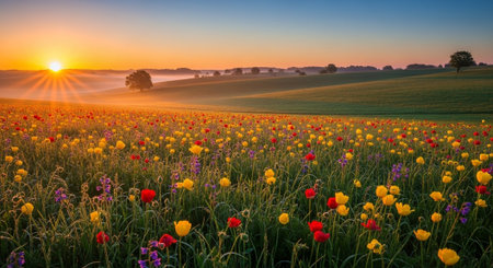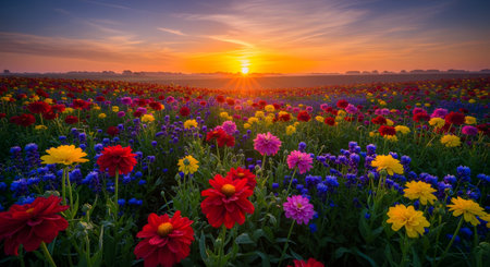 A vibrant landscape featuring a vast field of colorful wildflowers blooming under a golden sunrise. The scene showcases red, yellow, and purple flowers stretching to the horizon, creating a peaceful and scenic view.
