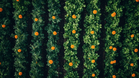 An aerial perspective showcasing vibrant marigold flowers blooming amidst lush green vegetables. This image captures the essence of organic farming and seasonal beauty.