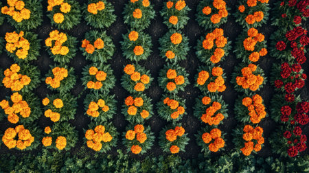 Aerial view of a flower garden showcasing bright orange and red blooms. The vibrant colors create a stunning pattern in a well-kept outdoor space, perfect for nature lovers.