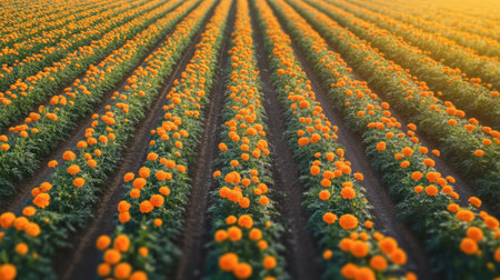 A stunning view of vibrant orange marigold flowers blooming in organized rows. This scenic field captures the beauty of nature in full bloom.