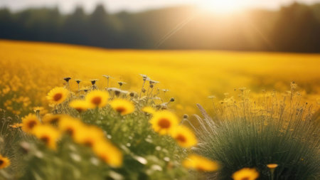 Beautiful field of yellow flowers in the sunset light. Landscape nature banner