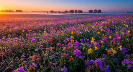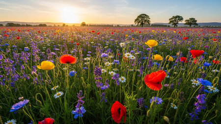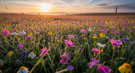 Vibrant showing vast field of vibrant wildflowers in full bloom with red yellow blue and purple flowers under a hazy sunrise sky casting long shadows across the...