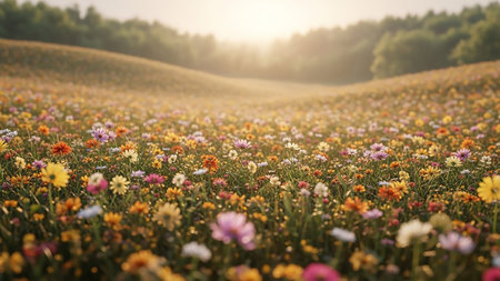 A breathtaking view of a sunlit meadow overflowing with a diverse array of colorful wildflowers. The sun's rays stream through the background, creating a warm, golden glow and a soft bokeh effect. Gentle, rolling hills covered in greenery and trees form the backdrop, evoking a sense of peaceful, idyllic nature.