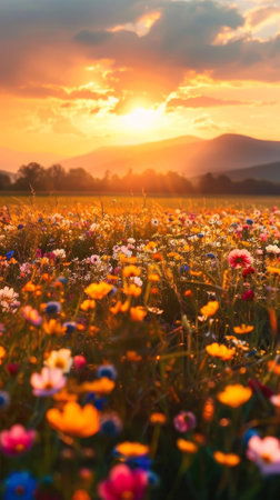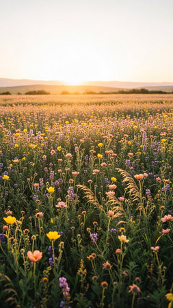 A sprawling meadow filled with diverse wildflowers in shades of yellow, pink, and purple basks in the warm glow of a setting sun.