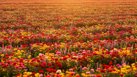 An expansive field filled with densely packed, vibrant red, yellow, and pink flowers, illuminated by warm golden hour sunlight.