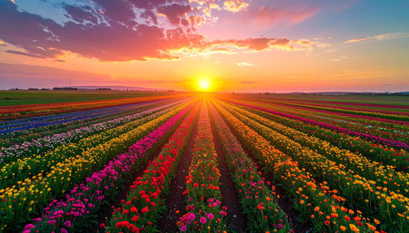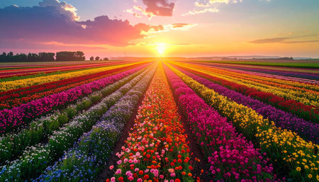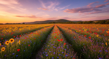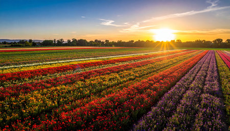 A field bursting with colorful flowers vast under the setting sun, creating a mesmerizing view of natures beauty and tranquility.