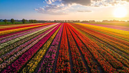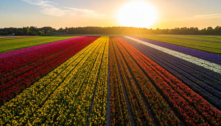 Aerial view of a vast field with long horizontal stripes of colorful blooming flowers in red, yellow, purple, and pink during sunset.