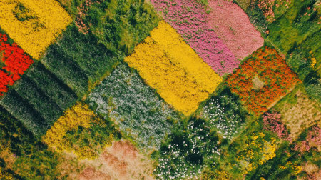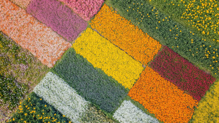 The breathtaking aerial perspective captures a vibrant mosaic of blossoming flower fields, showing an array of colors as spring brings life to the landscape.