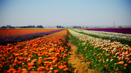 Backgrounds/ showing vast agricultural fields showcasing vibrant rows of red poppies white wildflowers orange blossoms and purple lavender under a bright morning...