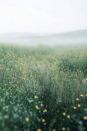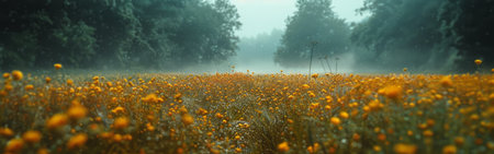 Beautiful meadow with yellow flowers on foggy day. Toned.