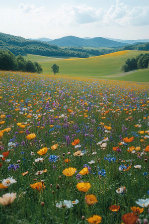 A colorful and vibrant meadow full of blooming flowers, creating a picturesque and idyllic summer scene