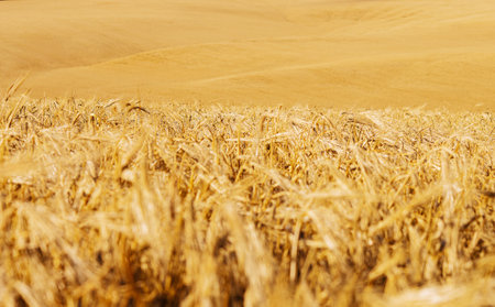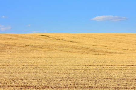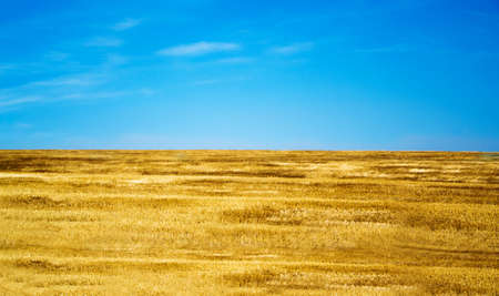 Golden stubble field after harvest under a blue sky, nature background and agriculture concept, copy space, selected focus, narrow depth of field