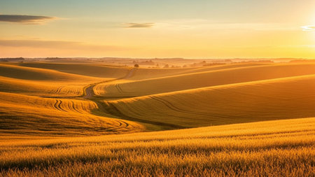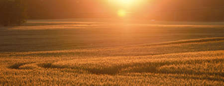 Sunset or sunrise golden hour over a field of wheat crops growing on farm