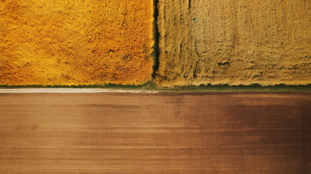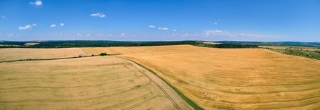 Aerial landscape view of yellow cultivated agricultural field with ripe wheat on bright summer day